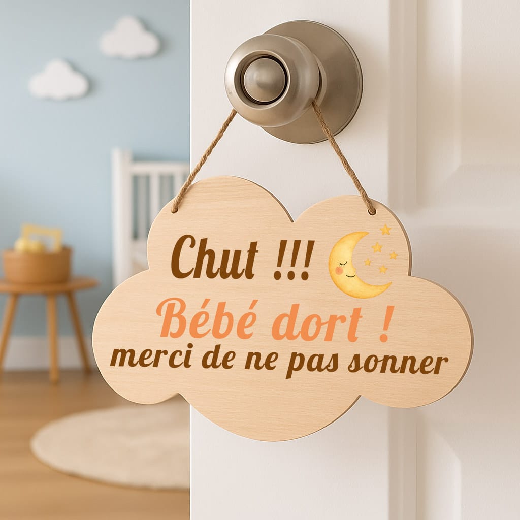 Préservez la tranquillité de votre enfant avec cette plaque de porte en bois en forme de nuage, ornée du message « Chut !!! Bébé dort ! Merci de ne pas sonner ».